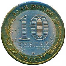Аверс: в центре диска – обозначение достоинства монеты «10 РУБЛЕЙ». Внутри цифры «0» – скрытые, видимые поочередно при изменении угла зрения изображения цифры «10» и надписи «РУБ». В нижней части диска – товарный знак монетного двора. В верхней части кольца по окружности – надпись: «БАНК РОССИИ», в нижней – дата «2007», слева и справа – стилизованные ветви растений, переходящие на диск.