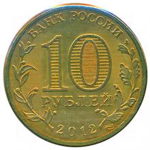 Аверс: в центре диска - обозначение номинала монеты "10 РУБЛЕЙ". Внутри цифры "0" - скрытые, видимые поочередно при изменении угла зрения изображения цифры "10" и надписи "РУБ". По окружности вдоль канта - надписи, вверху: "БАНК РОССИИ", внизу - дата: "2012", слева - стилизованное изображение оливковой ветви, справа - дубовой.