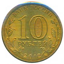Аверс: в центре диска - обозначение номинала монеты "10 РУБЛЕЙ". Внутри цифры "0" - скрытые, видимые поочередно при изменении угла зрения изображения цифры "10" и надписи "РУБ". По окружности вдоль канта - надписи, вверху: "БАНК РОССИИ", внизу - дата: "2012", слева - стилизованное изображение оливковой ветви, справа - дубовой.