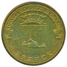 Реверс: герб города Брянска, над ним, на ленте – надпись полукругом: "ГОРОДА ВОИНСКОЙ СЛАВЫ", внизу, вдоль канта – надпись: "БРЯНСК".