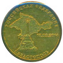 Реверс: на фоне контурных очертаний Крымского полуострова – рельефное изображение Памятника затопленным кораблям в Севастопольской бухте, справа – дата "18.03.2014", вдоль канта – надписи, вверху: "РОССИЙСКАЯ ФЕДЕРАЦИЯ", внизу: "СЕВАСТОПОЛЬ".