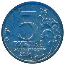 Аверс: в центре диска – обозначение номинала монеты: "5 РУБЛЕЙ", ниже – надпись: "БАНК РОССИИ", под ней – год чеканки: "2014", слева и справа – стилизованная ветка растения, справа у канта – товарный знак монетного двора.