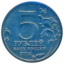 Аверс: в центре диска – обозначение номинала монеты: "5 РУБЛЕЙ", ниже – надпись: "БАНК РОССИИ", под ней – год чеканки: "2014", слева и справа – стилизованная ветка растения, справа у канта – товарный знак монетного двора.