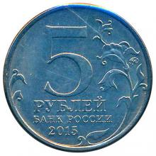 Аверс: в центре – обозначение номинала монеты в две строки: "5 РУБЛЕЙ", ниже – надпись: "БАНК РОССИИ", под ней – год чеканки: "2015", слева и справа – стилизованная ветка растения, справа у канта – товарный знак монетного двора.
