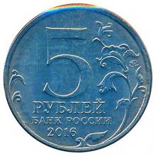 Аверс: в центре диска – обозначение номинала монеты в две строки: "5 РУБЛЕЙ", ниже – надпись: "БАНК РОССИИ", под ней – год чеканки: "2016", слева и справа – стилизованная ветка растения, справа у канта – товарный знак монетного двора.