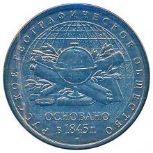 Реверс: в центре – изображение глобуса, стоящего на книге в окружении свитка, подзорной трубы и веток лавра, под ними – надпись в две строки: "ОСНОВАНО в 1845 г.", надпись вдоль канта: "РУССКОЕ ГЕОГРАФИЧЕСКОЕ ОБЩЕСТВО", разделенная внизу точкой.