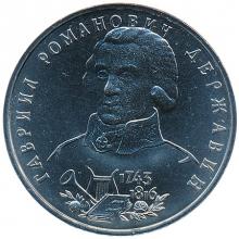 Реверс: Портрет Г.Р. Державина в мундире сенатора, под ним - изображения лиры, трубы и книги на фоне лавровых ветвей - символов поэзии и просвещения, по окружности - надпись: "ГАВРИИЛ РОМАНОВИЧ ДЕРЖАВИН", справа - даты в две строки: "1743", "1816".
