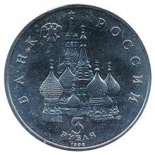 Аверс: в центре диска - изображения куполов собора Покрова на рву и Спасской башни, слева над ними - двуглавый орёл, справа под ними - товарный знак монетного двора, по окружности - надписи: вверху - "БАНК РОССИИ", внизу в три строки - "3 РУБЛЯ" "1992".