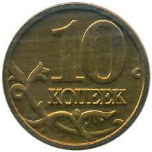 - в центре (ближе к правому краю) – обозначение номинала монеты: цифра 10, под ней - слово "КОПЕЕК", расположенное горизонтально;