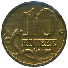 - в центре (ближе к правому краю) – обозначение номинала монеты: цифра 10, под ней - слово "КОПЕЕК", расположенное горизонтально;