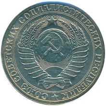 Реверс: в середине герб СССР с пятнадцатью витками перевязывающей ленты, обрамленный круговым ободком из сдвоенной линии. Между ним и обрезом монеты надпись "Союз Советских Социалистических Республик". Начало и окончание надписи разделено звездочкой.