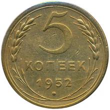 Аверс: номинал "5 копеек", написанный в две строки, под ним дата, ниже - точка. По бокам колосья, стебли которых пересекаются и образуют круговой ободок.