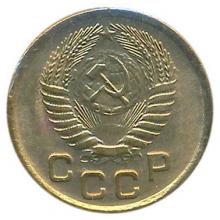 Реверс: герб СССР с одиннадцатью витками перевязывающей ленты. Под ним полукругом со ступенчатым расположением букв надпись "СССР".