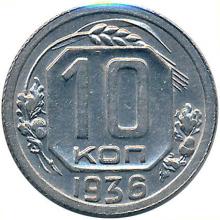 Аверс: в центре восьмиугольный щиток, в нем номинал "10 коп", написанный в две строки.По сторонам щитка слева - дубовые листья и желудь, смотрящие вниз, справа - дубовые листья и желудь, смотрящие вверх. Над щитком колос с остями, образующими гребенку. Под щитком дата.