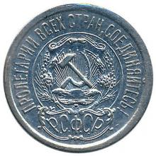 Реверс: в середине монеты стилизованный герб РСФСР - на геральдическом щите на фоне лучей солнца скрещенные серп и молот. По сторонам - связки колосьев. Вся композиция обрамлена круговым ободком, который разорван внизу картушем с надписью "РСФСР". Между обрезом монеты и ободком лозунг "Пролетарии всех стран, соединяйтесь!".