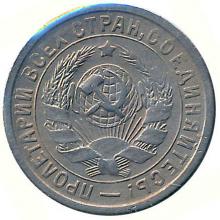 Реверс: герб СССР с семью витками перевязывающей ленты ограниченный линейным круговым ободком. Между обрезом монеты и ободком лозунг "Пролетарии всех стран, соединяйтесь!". Между первой и последней буквами лозунга тире.