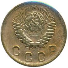 Реверс: герб СССР с одиннадцатью витками перевязывающей ленты. Под ним полукругом со ступенчатым расположением букв надпись "СССР".