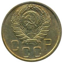 Реверс: герб СССР с одиннадцатью витками перевязывающей ленты. Под ним полукругом со ступенчатым расположением букв надпись "СССР".