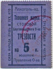 Аверс: фон фиолетовый. Талонная марка на - 5 копеек. Алкоголь - яд. Благовещенское Общество Трезвости. Печать розовая.