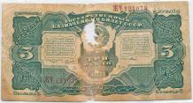 Реверс: фон многоцветный. В центре номинал прописью, по краям крупные цифры - 3.