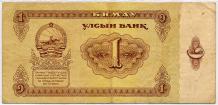 Аверс: фон желто-коричневый. В центре цифры - 1, слева - герб Монголии.