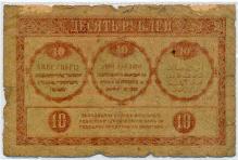 Реверс: фон зелено-коричневый. Вверху номинал - 10 рублей.