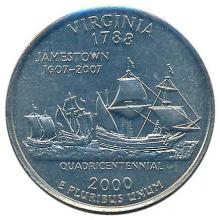 Реверс: Корабли "Susan Constant", "Godspeed" и "Discovery" доставившие английских переселенцев в 1607 г. в Джеймстаун (Вирджиния) - первое английское постоянное поселение. Надписи: "Jamestown, 1607-2007" (Джеймстаун, 1607-2007), "Quadricentennial" (Четырехсотлетие). Под названием штата VIRGINIA год 1788 - год присоединения к США (25 июня).