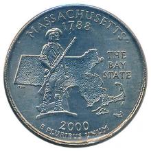 Реверс: Памятник народному ополченцу времен американской революции (Minutemen) на фоне контуров штата. Надпись: "The Bay State" (Штат у залива). Под названием штата MASSACHUSETTS год 1788 - год присоединения к США (6 февраля).