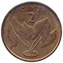 Реверс: В центре – гигантское таро (Алоказия), вверху номинал в две строки: "CENTS 2".