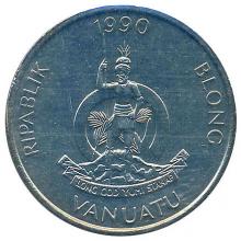 Аверс: герб страны: меланезийский воин или вождь с копьём в руках, который стоит перед вулканом. В нижней части герба расположен национальный девиз страны: «Long God yumi stanap» (в переводе с языка бислама «За Богом мы стоим»). Позади изображения воина — государственная эмблема Вануату: два зелёных листа саговника, за которыми — серебряный кабаний клык. Круговая надпись: RIPABLIK "Год чеканки" BLONG VANUATU.