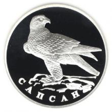 Реверс: рельефное изображение сокола сапсана, ниже по окружности - надпись: "САПСАН".