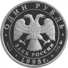 Аверс: в центре диска — эмблема Банка России (двуглавый орел художника И. Билибина, под ним надпись полукругом «БАНК РОССИИ»), обрамленная кругом из точек и надписями по кругу: вверху — «ОДИН РУБЛЬ», внизу — «1998 г.», слева — обозначение металла, проба сплава, справа — содержание драгоценного металла в чистоте и товарный знак монетного двора.