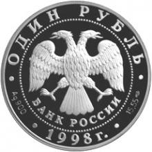 Аверс: в центре диска — эмблема Банка России (двуглавый орел художника И. Билибина, под ним надпись полукругом «БАНК РОССИИ»), обрамленная кругом из точек и надписями по кругу: вверху — «ОДИН РУБЛЬ», внизу — «1998 г.», слева — обозначение металла, проба сплава, справа — содержание драгоценного металла в чистоте и товарный знак монетного двора.