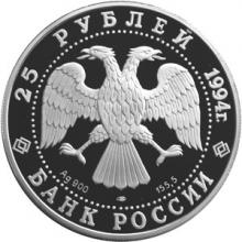 Аверс: изображение двуглавого орла (художник И. Билибин), по кругу надписи: вверху - "25 РУБЛЕЙ 1994", внизу - "БАНК РОССИИ". В нижней части - обозначение металла, проба сплава, содержание драгоценного металла в чистоте и товарный знак монетного двора.