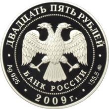 Аверс: в центре - эмблема Банка России (двуглавый орёл с опущенными крыльями, под ним - надпись полукругом "БАНК РОССИИ"), обрамленная кругом из точек и надписями по кругу - вверху: "ДВАДЦАТЬ ПЯТЬ РУБЛЕЙ", внизу: слева - обозначения драгоценного металла и пробы сплава, в центре - дата выпуска "2009 г.", справа- содержание химически чистого металла и товарный знак монетного двора.