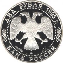По окружности надписи, обрамлённые кругом из точек: вверху - «ДВА РУБЛЯ 1995 г.», внизу - «БАНК РОССИИ».