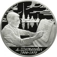 Реверс: изображение композитора за роялем, работающего над партитурой, внизу – надпись в две строки: «Д. ШОСТАКОВИЧ» и даты «1906-1975», на втором плане – очертания зданий Петропавловской крепости, отражающихся в воде.