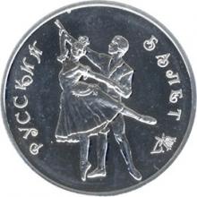 Реверс: в центре - танцующий балетный дуэт, слева направо по окружности - надпись: "РУССКИЙ БАЛЕТ".