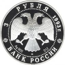 Аверс: в центре диска - эмблема Банка России (двуглавый орёл художника И. Билибина), под ним: слева - обозначение металла, проба сплава, в центре - товарный знак монетного двора, справа - содержание драгоценного металла в чистоте. По окружности надписи, обрамлённые кругом из точек: вверху - "3 РУБЛЯ 1993 г.", внизу - "БАНК РОССИИ".