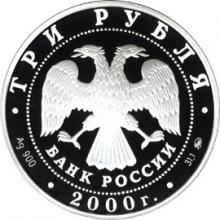 Аверс: в центре диска - эмблема Банка России (двуглавый орёл художника И. Билибина, под ним надпись полукругом "БАНК РОССИИ"), обрамлённая кругом из точек и надписями по кругу: вверху - "ТРИ РУБЛЯ", внизу - "2000 г.", слева - обозначение металла, проба сплава, справа - содержание драгоценного металла в чистоте и товарный знак монетного двора.