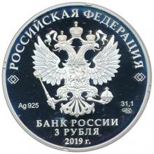 Аверс: на зеркальном поле диска – рельефное изображение Государственного герба Российской Федерации, над ним вдоль канта – надпись полукругом: "РОССИЙСКАЯ ФЕДЕРАЦИЯ", обрамленная с обеих сторон сдвоенными ромбами, внизу под гербом: слева – обозначения драгоценного металла и пробы сплава, справа – содержание химически чистого металла и товарный знак монетного двора, внизу в центре в три строки – надпись: "БАНК РОССИИ", номинал монеты: "3 РУБЛЯ", год выпуска: "2019 г.".