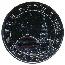 По окружности надписи, обрамлённые кругом из точек: вверху - "ТРИ РУБЛЯ 1993 г.", внизу - "БАНК РОССИИ".