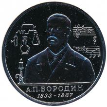 Реверс: портрет А.П.Бородина, справа - нотный текст, слева - химические сосуды и свеча, внизу - надпись: "А.П. БОРОДИН" и даты: "1833 - 1887".