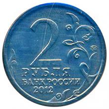 Аверс: в центре диска - обозначение номинала монеты в две строки: "2 РУБЛЯ", ниже - надпись: "БАНК РОССИИ", под ней - год чеканки: "2012", слева и справа - стилизованная ветка растения, справа у канта - товарный знак монетного двора.