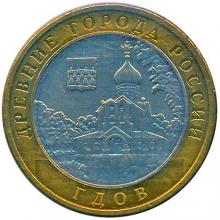 Реверс: в центре – изображение собора Державной иконы Божией Матери, слева – герб города Гдова, по окружности – надписи: вверху – «ДРЕВНИЕ ГОРОДА РОССИИ», внизу – «ГДОВ».