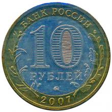 Аверс: в центре диска – обозначение достоинства монеты «10 РУБЛЕЙ». Внутри цифры «0» – скрытые, видимые поочередно при изменении угла зрения изображения цифры «10» и надписи «РУБ». В нижней части диска – товарный знак монетного двора. В верхней части кольца по окружности – надпись: «БАНК РОССИИ», в нижней – дата «2007», слева и справа – стилизованные ветви растений, переходящие на диск.