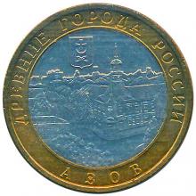 Реверс: на диске - архитектурная панорама города, над ней - герб города Азов, по окружности на кольце - надписи: вверху - "ДРЕВНИЕ ГОРОДА РОССИИ", внизу - "АЗОВ".