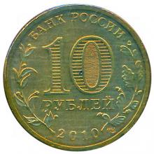 Аверс: в центре диска - обозначение номинала монеты "10 РУБЛЕЙ". Внутри цифры "0" - скрытые, видимые поочередно при изменении угла зрения изображения цифры "10" и надписи "РУБ". По окружности вдоль канта - надписи, вверху: "БАНК РОССИИ", внизу - дата: "2010", слева - стилизованное изображение оливковой ветви, справа - дубовой.