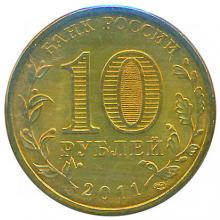 Аверс: в центре диска - обозначение номинала монеты "10 РУБЛЕЙ". Внутри цифры "0" - скрытые, видимые поочередно при изменении угла зрения изображения цифры "10" и надписи "РУБ". По окружности вдоль канта - надписи, вверху: "БАНК РОССИИ", внизу - дата: "2011", слева - стилизованное изображение оливковой ветви, справа - дубовой.