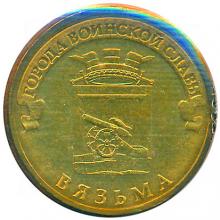 Реверс: герб города Вязьмы, над ним, на ленте - надпись полукругом: "ГОРОДА ВОИНСКОЙ СЛАВЫ", внизу, вдоль канта - надпись: "ВЯЗЬМА".